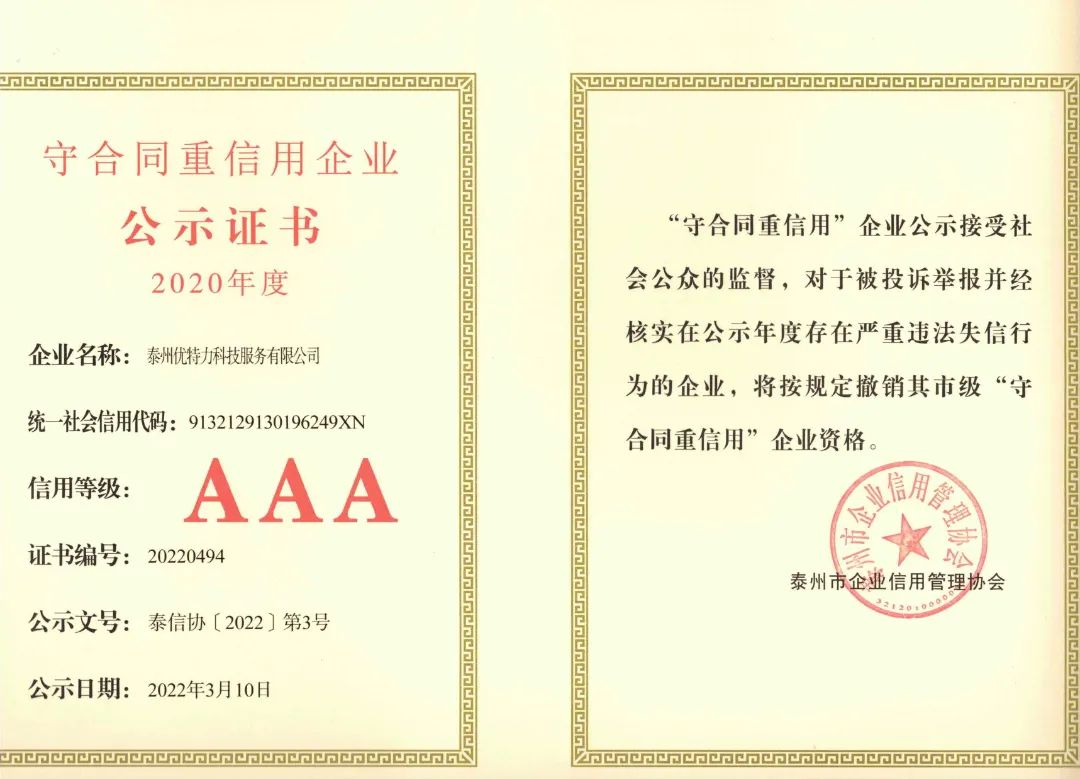 優特力科技榮獲泰州市“AAA級守合同重信用企業”稱號!