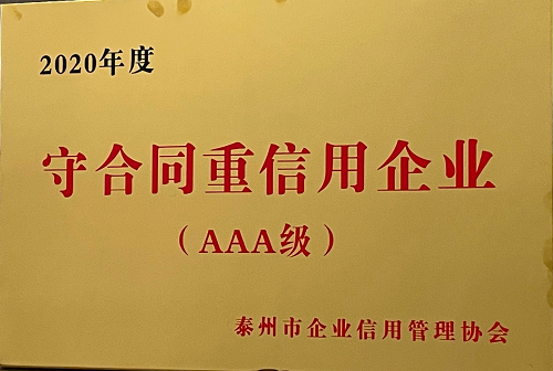 近日,我公司憑借良好的市場信譽與優質的服務,順利通過泰州市企業信用管理協會的評審,榮獲泰州市“AAA級守合同重信用企業”稱號!